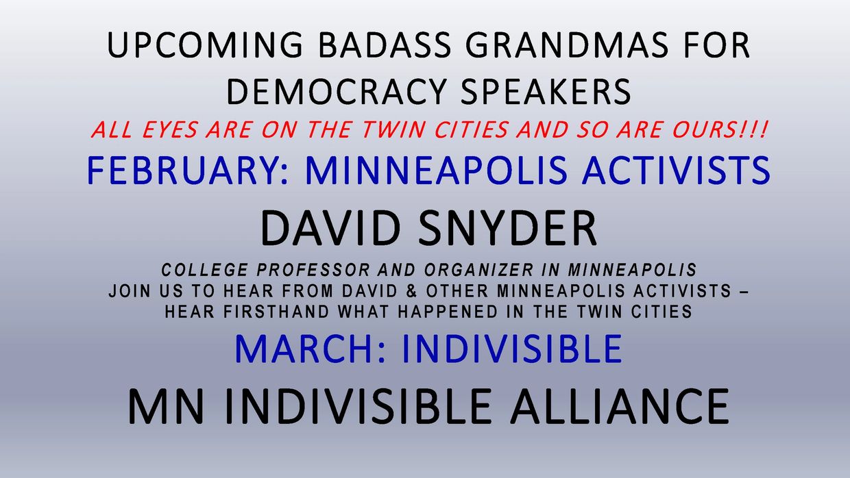 · Find your people, locally. League of Women Voters, Documenters, Indivisible, and countless other grass roots groups would be grateful for your involvement. If you have fellow BadAss Grandmas in your city, get together over coffee. Being in community with others who share our beliefs is essential for actions as well as our mental health. You are not alone!